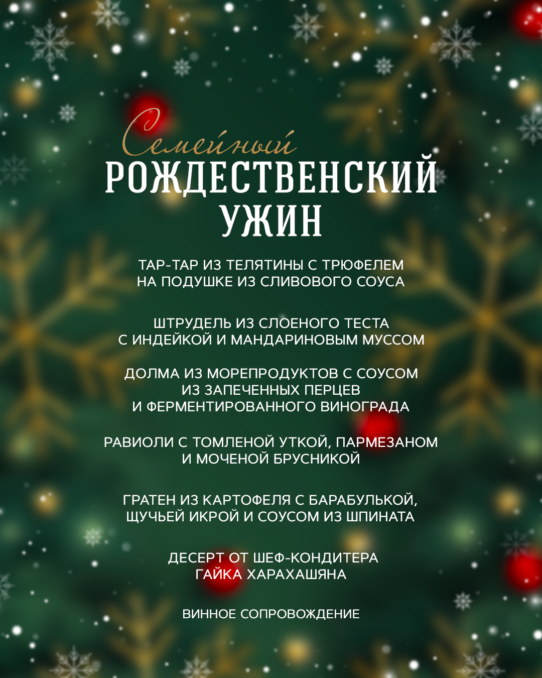 Как и положено на Рождество, ужин будет максимально семейным и уютным. Ждём и ваших деток — для них подготовлена специальная анимация!
