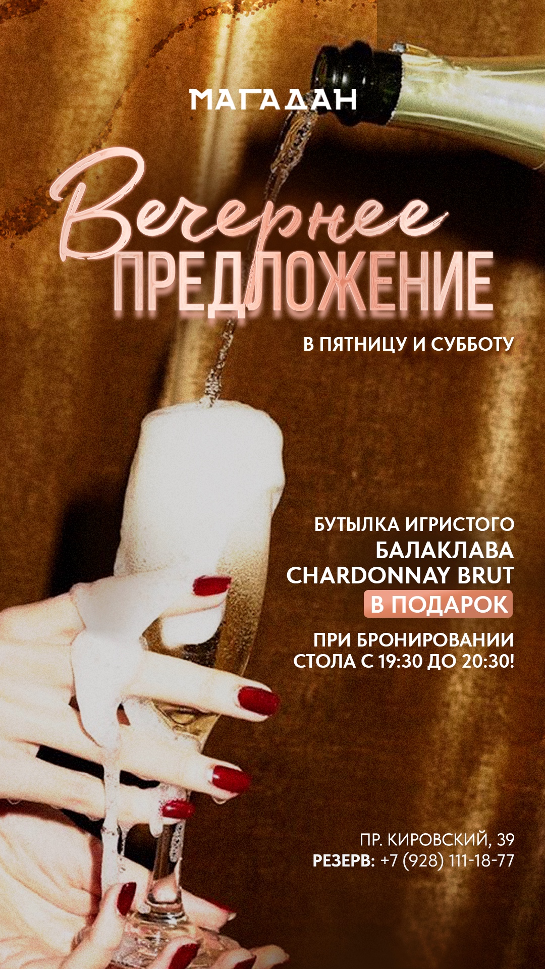 Чтобы они стали незабываемыми, дарим бутылку игристого Балаклава Chardonnay Brut при бронировании стола с 19:30 до 20:30🎁